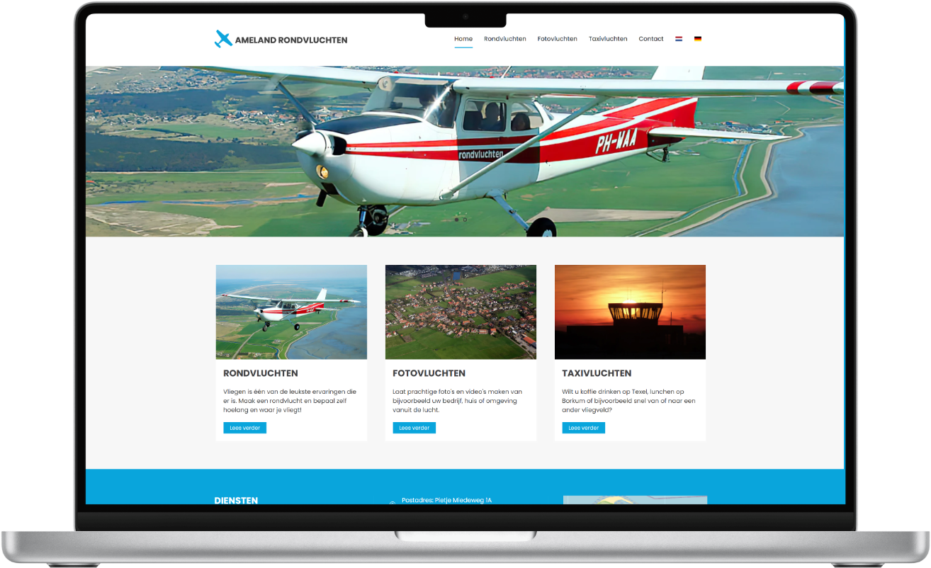 In opdracht van Vliegbedrijf Tom van der Meulen (bekend van Oostwold Airport) hebben we de volledige online aanwezigheid voor Ameland Rondvluchten gecreëerd.