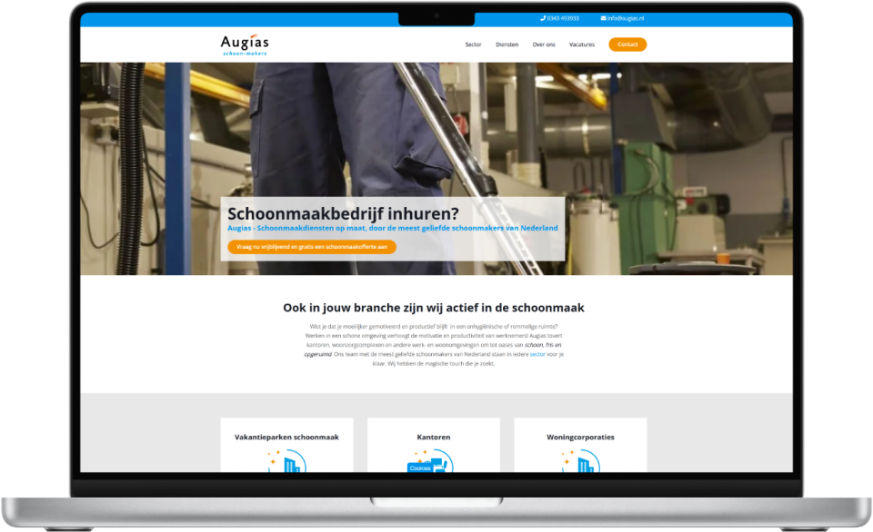 Voor het professionele schoonmaakbedrijf Augias Schoonmakers in Zeist hebben we een website ontwikkeld die hun kernwaarden weerspiegelt: fris, betrouwbaar en 'to the point'.