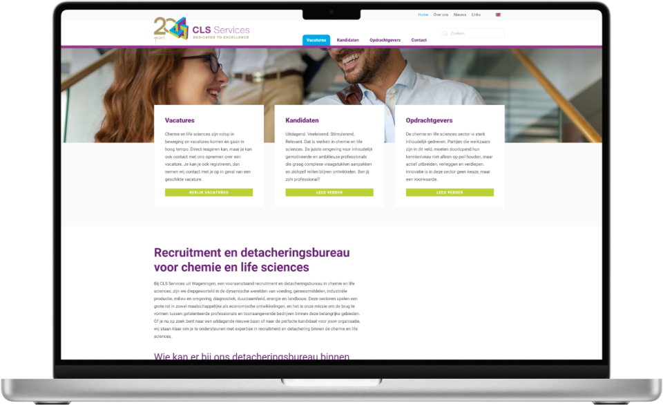 Voor CLS Services in Wageningen, een topspecialist in recruitment voor de Life Sciences, was een standaard website niet voldoende. De uitdaging was om hun eigen, maatwerk vacaturesysteem naadloos te integreren in een nieuwe, professionele en meertalige website.