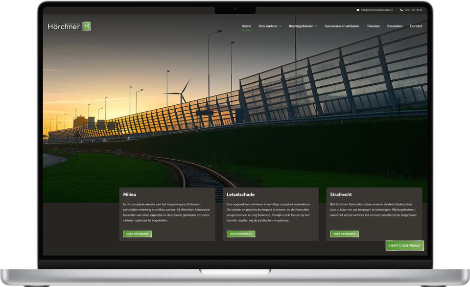 Al meer dan 13 jaar zijn wij de vaste digitale partner voor Hörchner Advocaten in Breda. Voor hun nieuwste website hebben we een ontwerp gerealiseerd dat professionaliteit en autoriteit uitstraalt, volledig uitgevoerd in 'dark mode' om perfect aan te sluiten bij hun huisstijl.