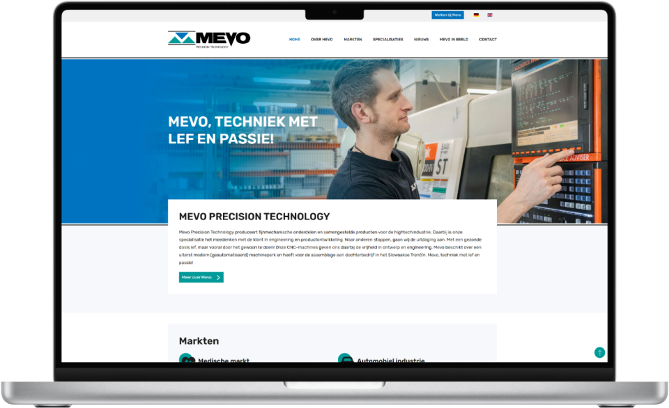 Voor Mevo Precision Technology in Ruurlo, een toonaangevende specialist in de high-tech verspaningsindustrie, was een website nodig die hun eigen kernwaarde weerspiegelt: precisie.